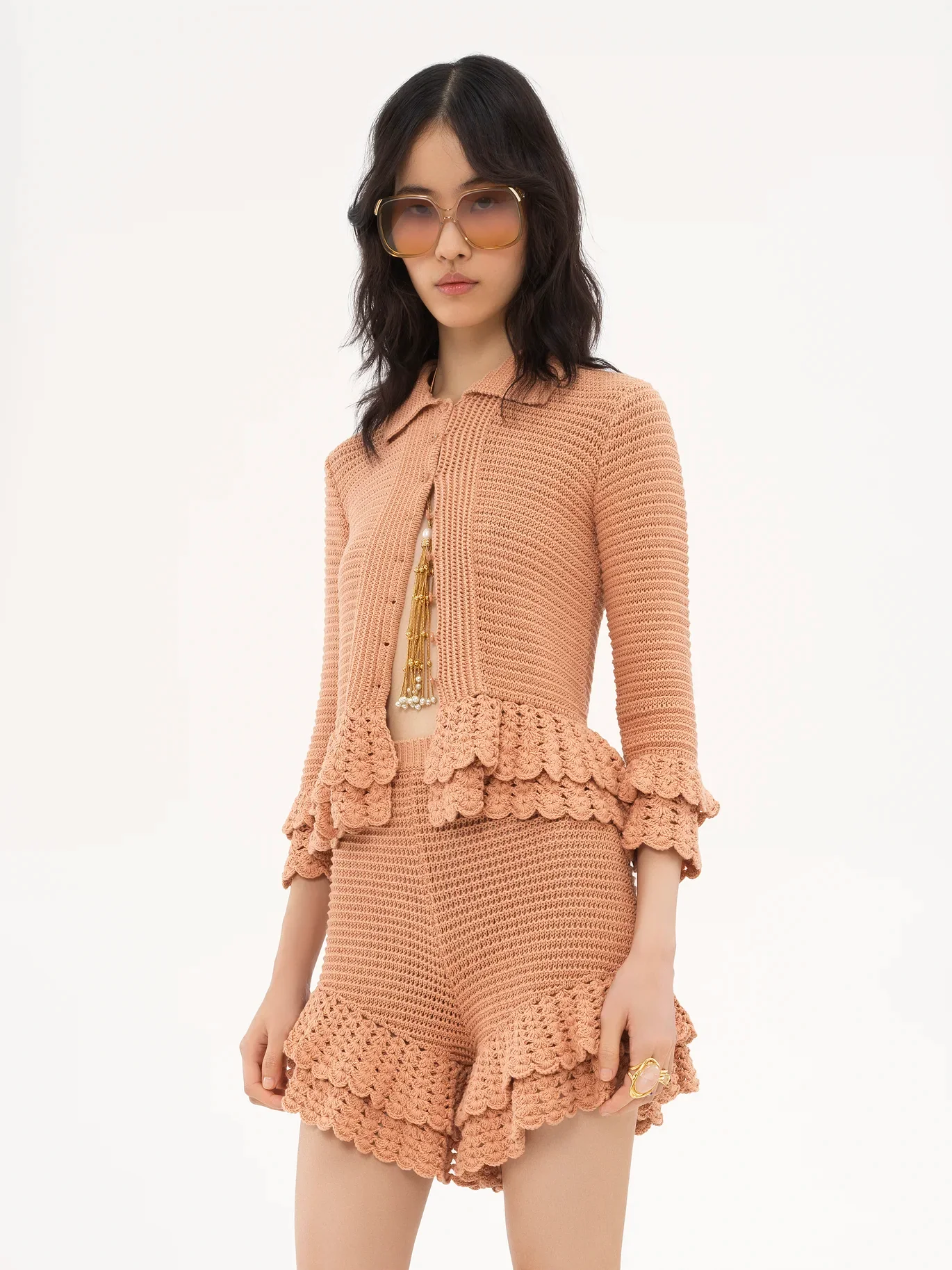 Fitted ruffled cardigan in a crochet knit, featuring mother-of-pearl buttons and layered frills at the hem and cuffs.