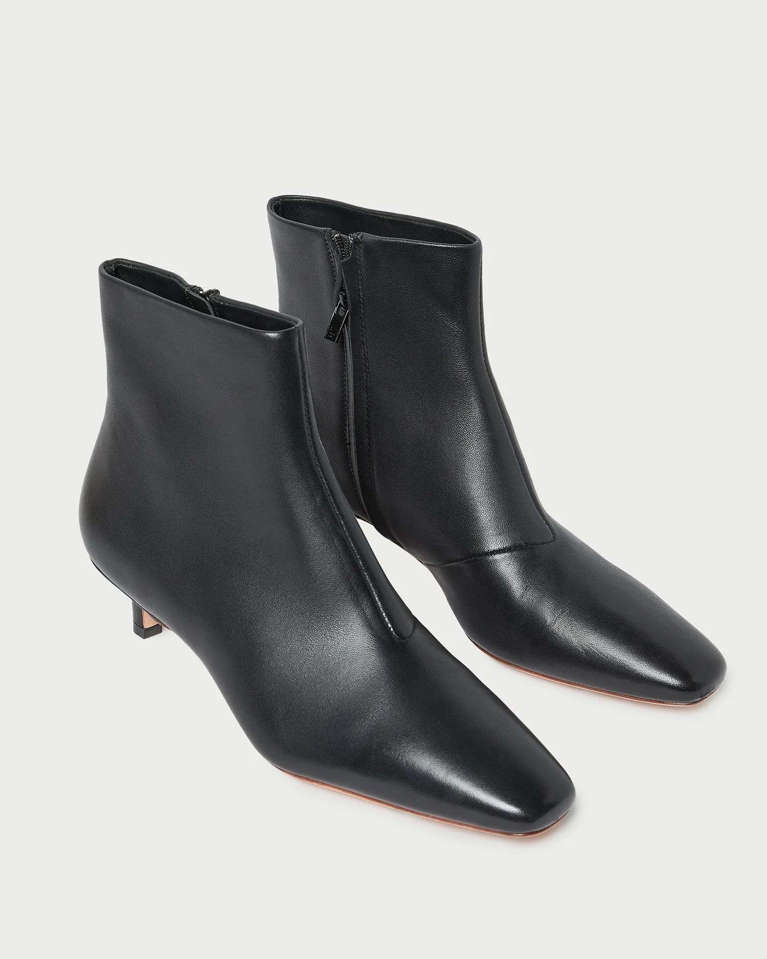 Skinny ankle boot in black leather. Features a padded leather footbed with gold stamped logo, a comfortable kitten heel, an elongated squared toe, and a concealed zipper closure. 1.5-inch heel.