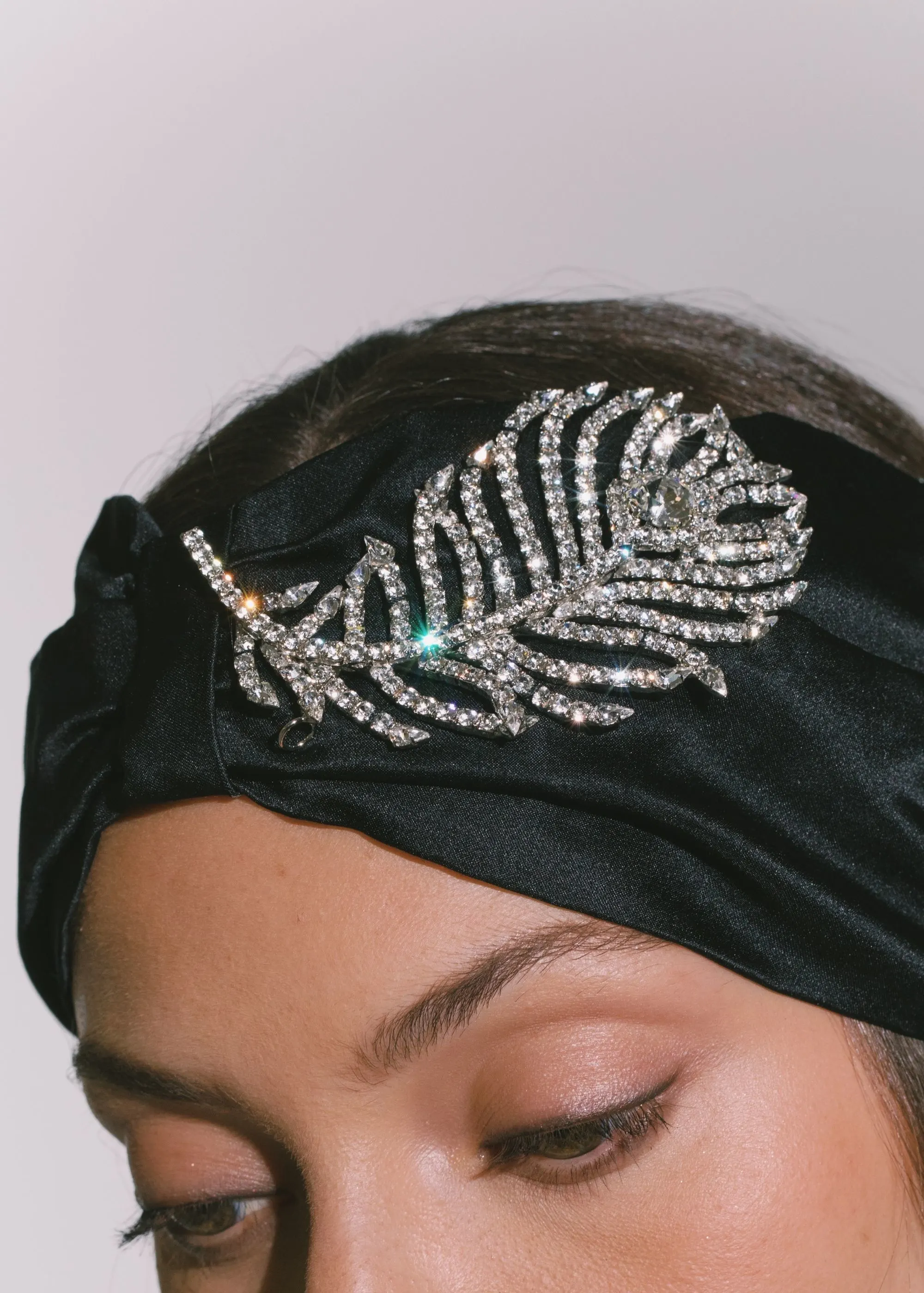 The Plume Headwrap is a lush silk headwrap adorned with a head-turning crystal peacock feather. Rendered with incredible detail, the feather appears to be in motion, a testament to its sculptural nature and handcraftsmanship. Made by hand in New York, each headwrap is draped by hand, with a covered elastic back to ensure a comfortable, flexible fit.