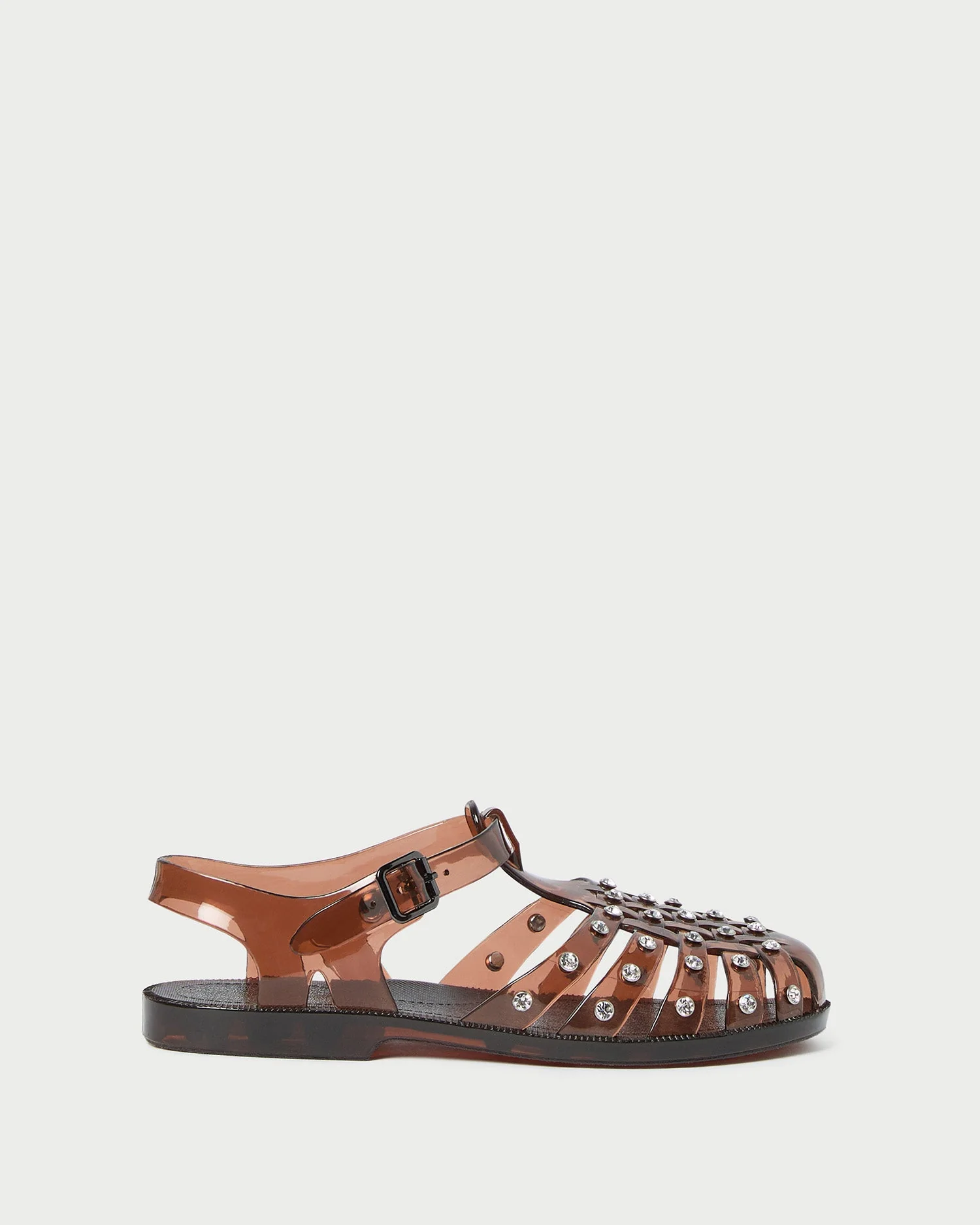 Flat caged sandal in brown jelly material with clear rhinestone embellishments. Features a buckle closure.