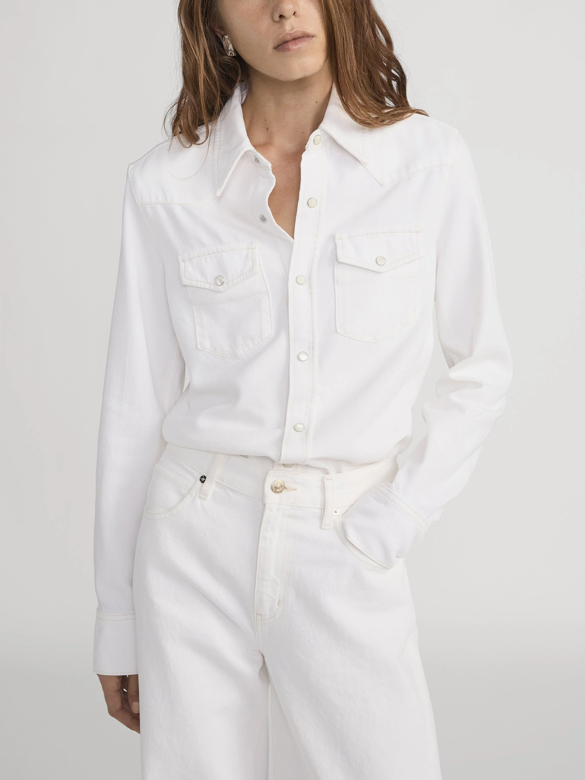A classic rigid denim shirt with Western-inspired, pearl-finish snaps. Slim cut for a fitted look.
