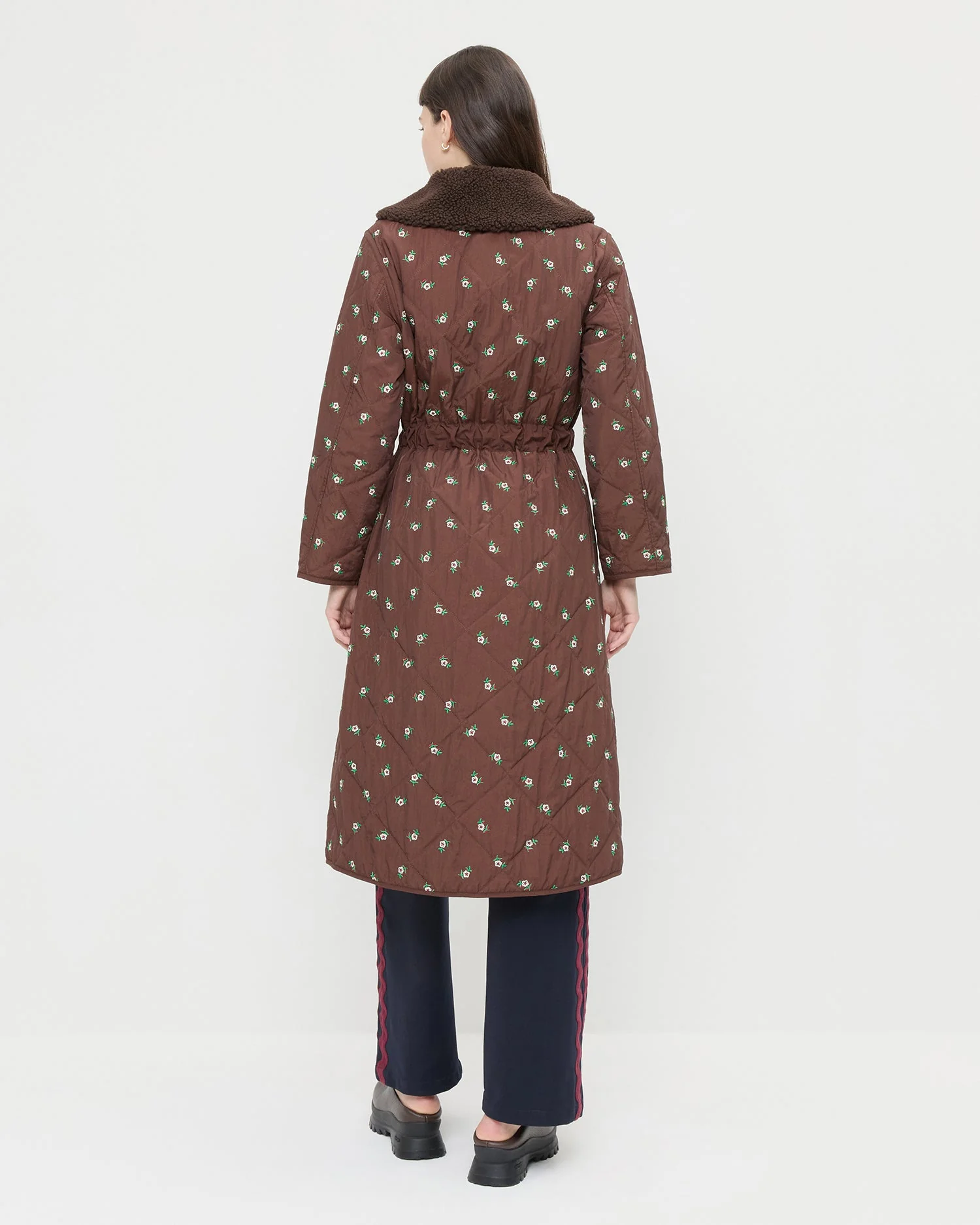 Coat in brown nylon with floral embroidery. Features a removable brown shearling collar, front patch pockets, and a waist tie.