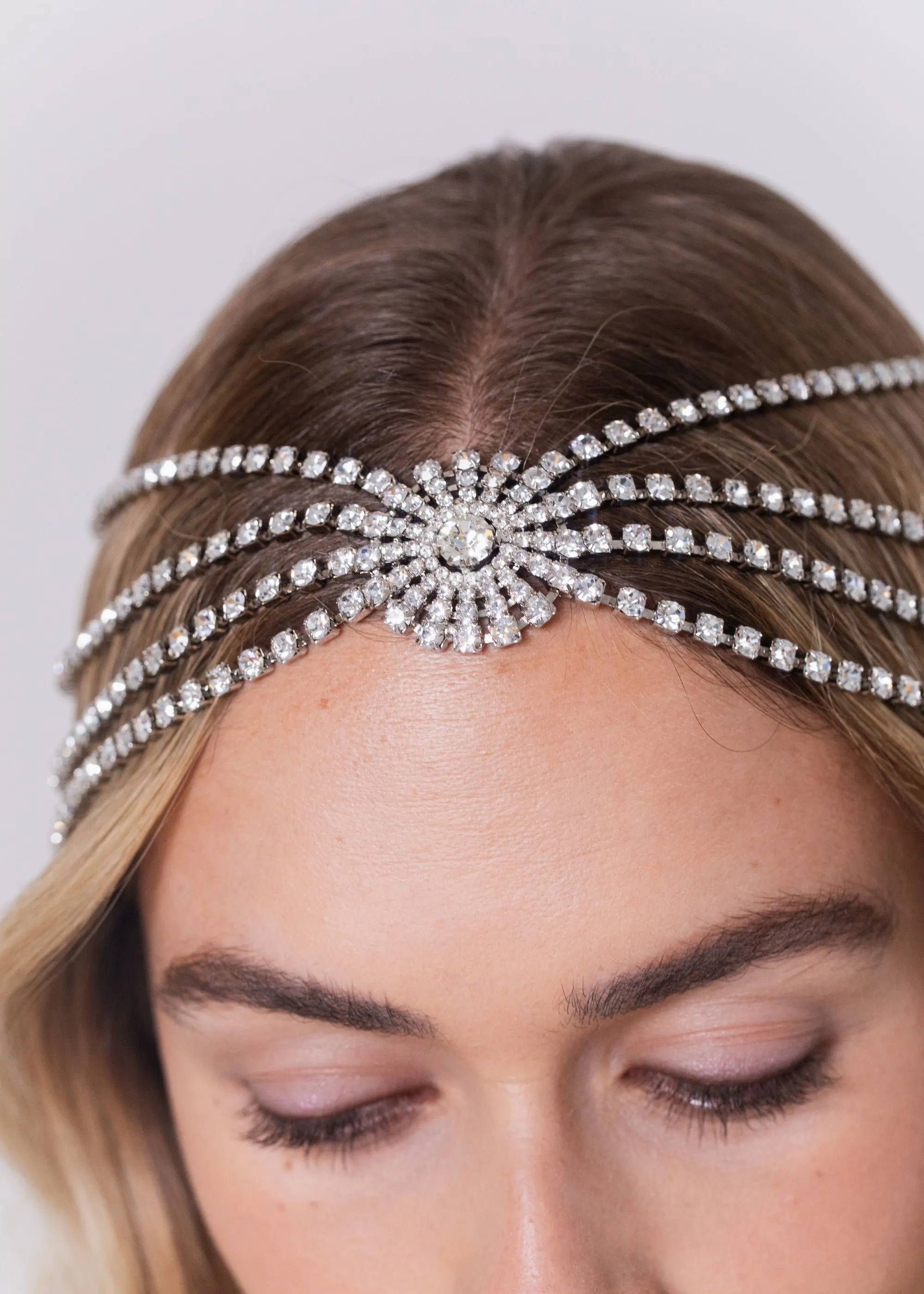 Inspired by 1920s headpieces, the Zelina Diadem is a modern interpretation of an iconic look. Made by hand in New York, Austrian crystal chains are draped along either side of the head. The strands center upon a mesmerizing crystal starburst at the center of the hairline.